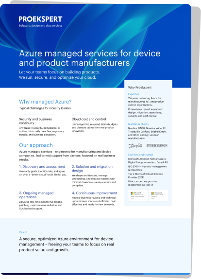 A leading European device manufacturer trusted Proekspert to architect, migrate, and run their business-critical Azure cloud – enabling secure connections for thousands of devices and seamless integration with external platforms.